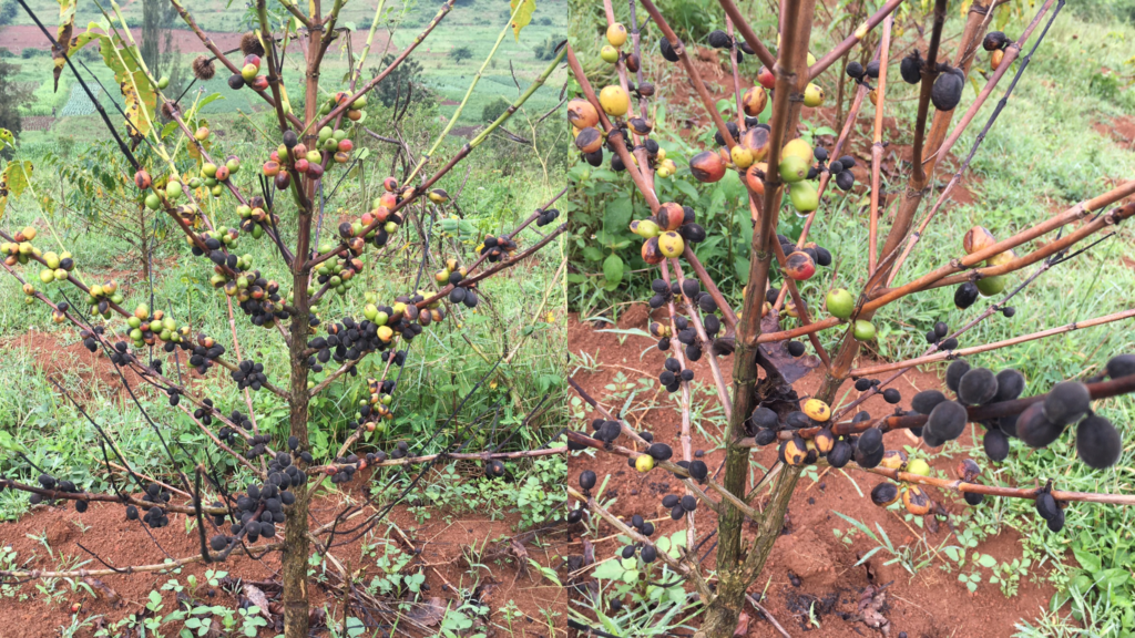 Tragedy came to our coffees suddenly… One day in March, the coffee trees started loosing leaves and their cherries that had been getting matured turning black… We asked the coffee experts to help coffees, but it was too late. It was caused by the complication from Coffee Berry Disease. Unfortunately almost all of coffee cherries got ruined just before coming harvest season…