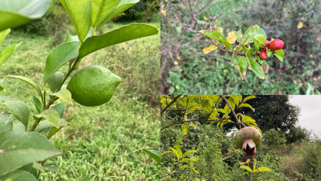 Lemons, pomegranates, and macadamias are growing well. The lemons and pomegranates have started to bear a few fruits, and the macadamia tree has reached a height of about 3 meters.